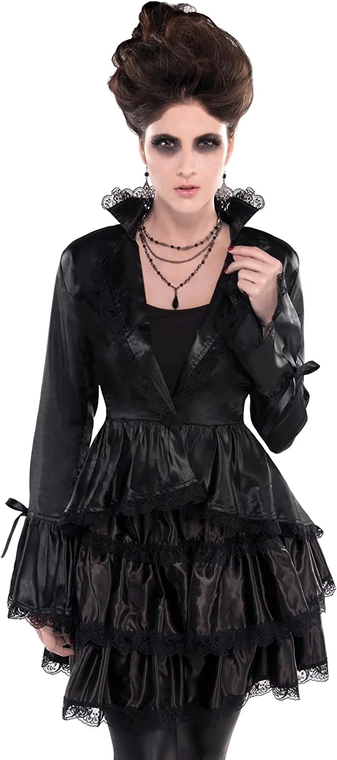 Transform yourself into a Gothic beauty in our romantic gothic jacket! This sleek jacket for women is made of smooth satin and has a skinny Lapel with a button closure at the waist.