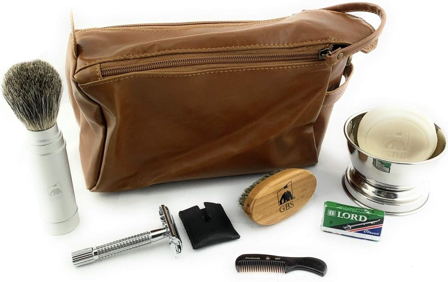 S Superb Grooming Set for Gentlemen- Perfect Travel Kit Toiletry Leather bag+100% Pure Badger Bristles, Double Edge Safety Razor, Chrome Shaving Bowl, Shaving Soap, Boar Beard Brush & Mustache CombG.