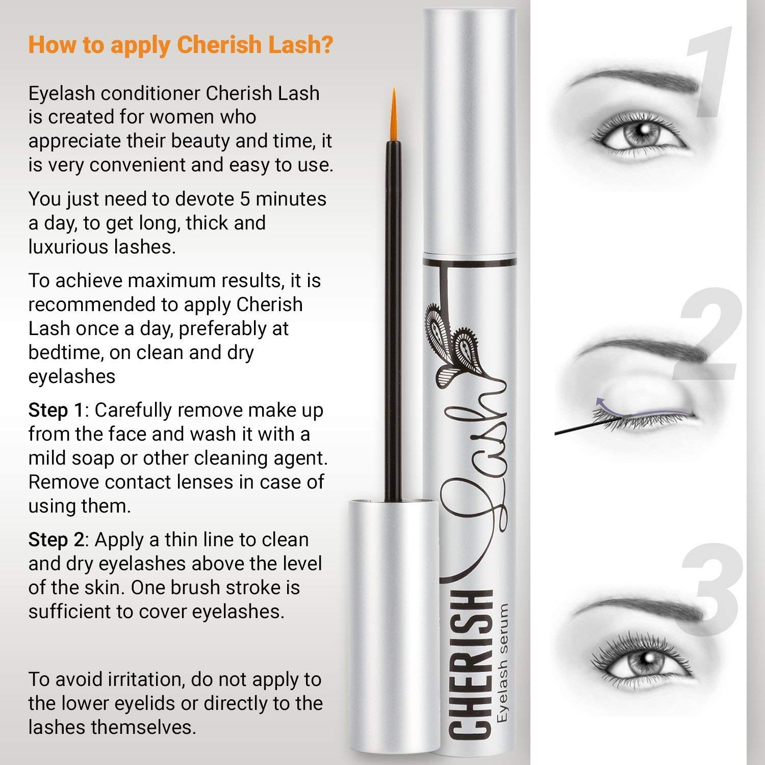 Eyelash conditioner Cherish Lash is created for women who appreciate their beauty and time, it is very convenient and easy to use. You just need to devote 5 minutes a day, to get long, thick and luxurious lashes. Step 1: Carefully remove make up from the face and wash it with a mild soap or other cleaning agent. Remove contact lenses in case of using them. Step 2: Apply a thin line to clean and dry eyelashes above the level of the skin. One brush stroke is sufficient to cover eyelashes.