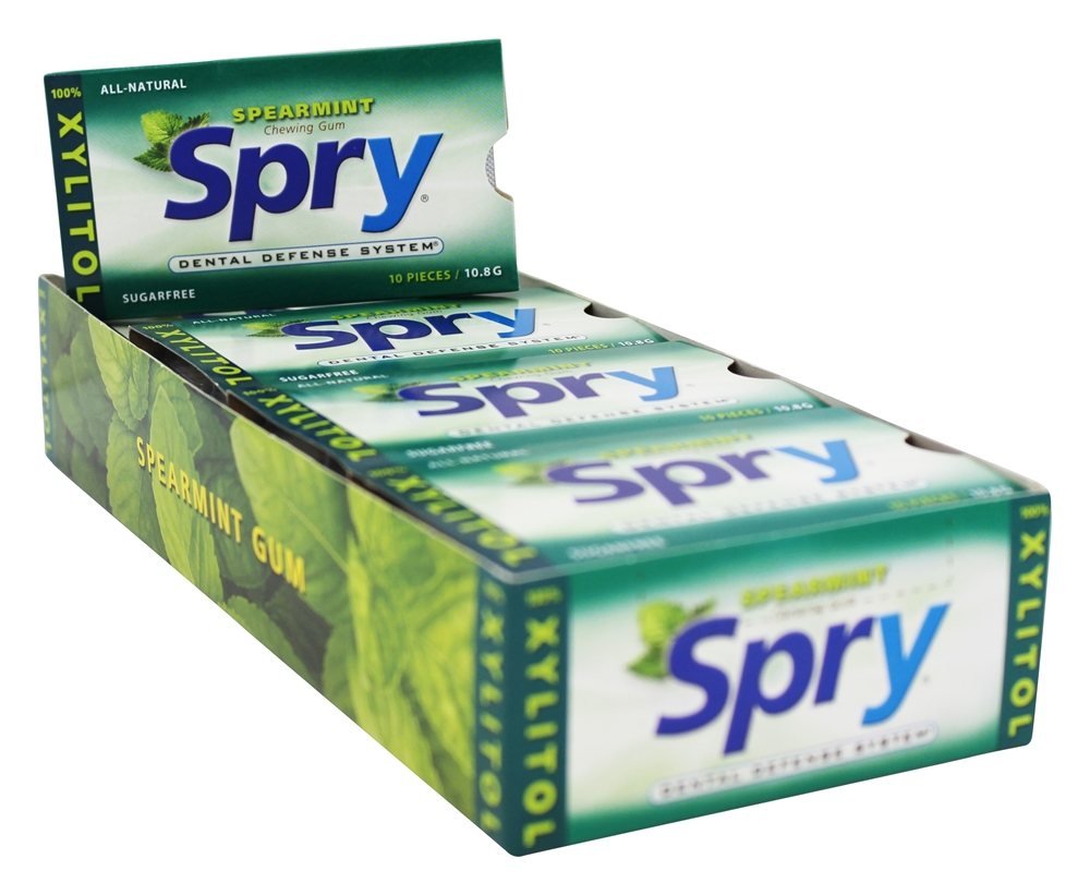 Spry Spearmint Chewing Gum – Sugar Free is sweetened with natural xylitol.