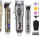 Barber Clippers Professional Set: This hair clipper & beard trimmer kit contains everything you need to have a professional cut right in the comfort of your own home. Cordless hair clipper is equipped with 8 guide combs, a detail hair trimmer is equipped with 3 guide combs, barber cape, cleaning brush, 2 USB charging cables, barber”s comb and protective cover.