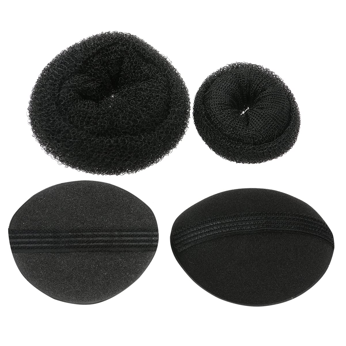 Package Including 2 x Sponge increased pad ( one large and one small ) 2 x Pull hair pin ( one large and one small ) 3 x French meatball head ( one large and two small ) 1 x Double hook plate made needle 5 x Helical coiled hair pins 10 x Black rubber band 40 x U- clips