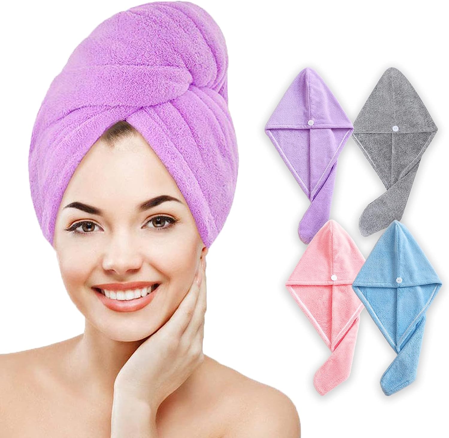 store 4-pack Microfiber hair wraps for women wet hair in two astounding colors featuring purple & Grey with a size of 65 x 25cm are created with ultra-absorbent, odorless microfiber fabric for swift drying.
