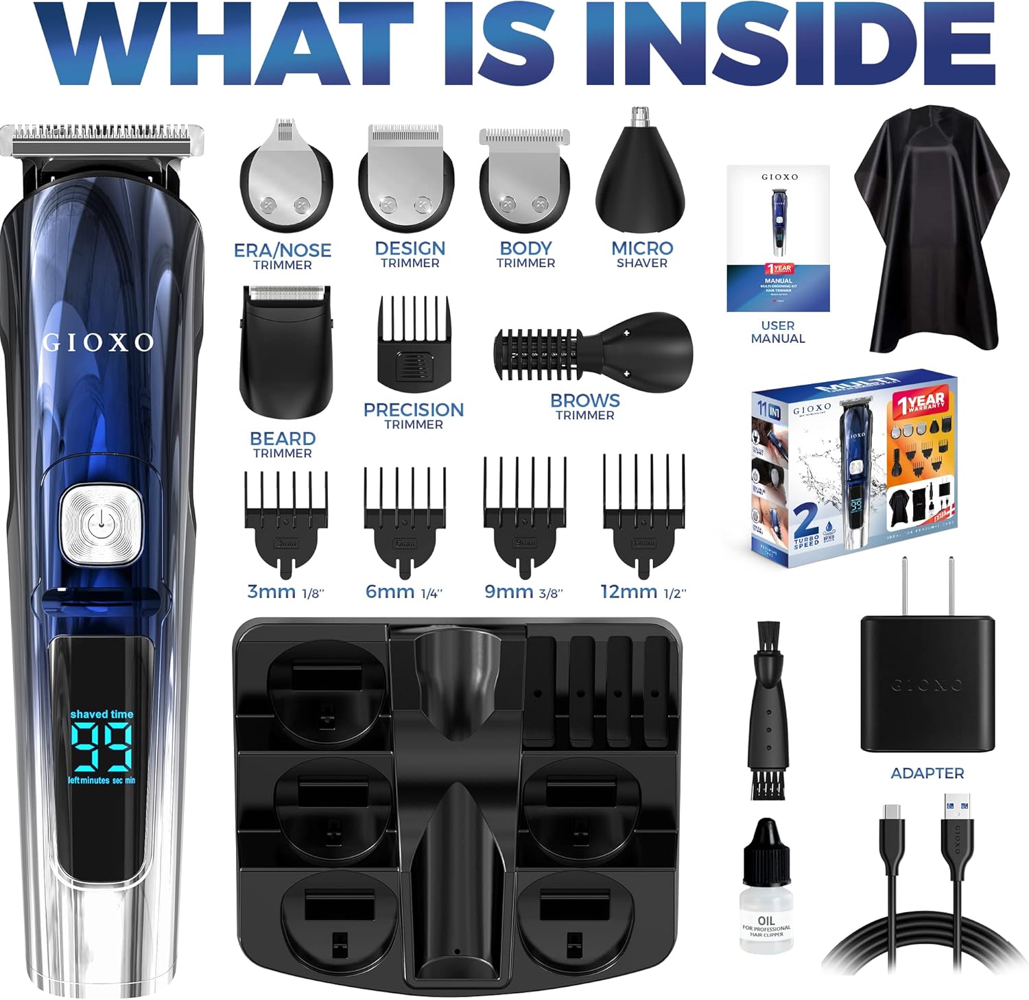 【All-In-One Hair Clipper and Beard Trimmer – Multi-Functional Grooming Kit】 11 attachments in 1 for all your Grooming Kit needs: Full size trimmer – hair clipper, design trimmer, precision trimmer, a nose and ear hair trimmer, micro shaver, body hair trimmer, five guide combs (labeled A through E) for full-size trimmer, stand base, lubricating oil, cleaning brush and a USB cable (5A 1A charger applicable), 1 travel bags for storing, Peignoir cape barber.
