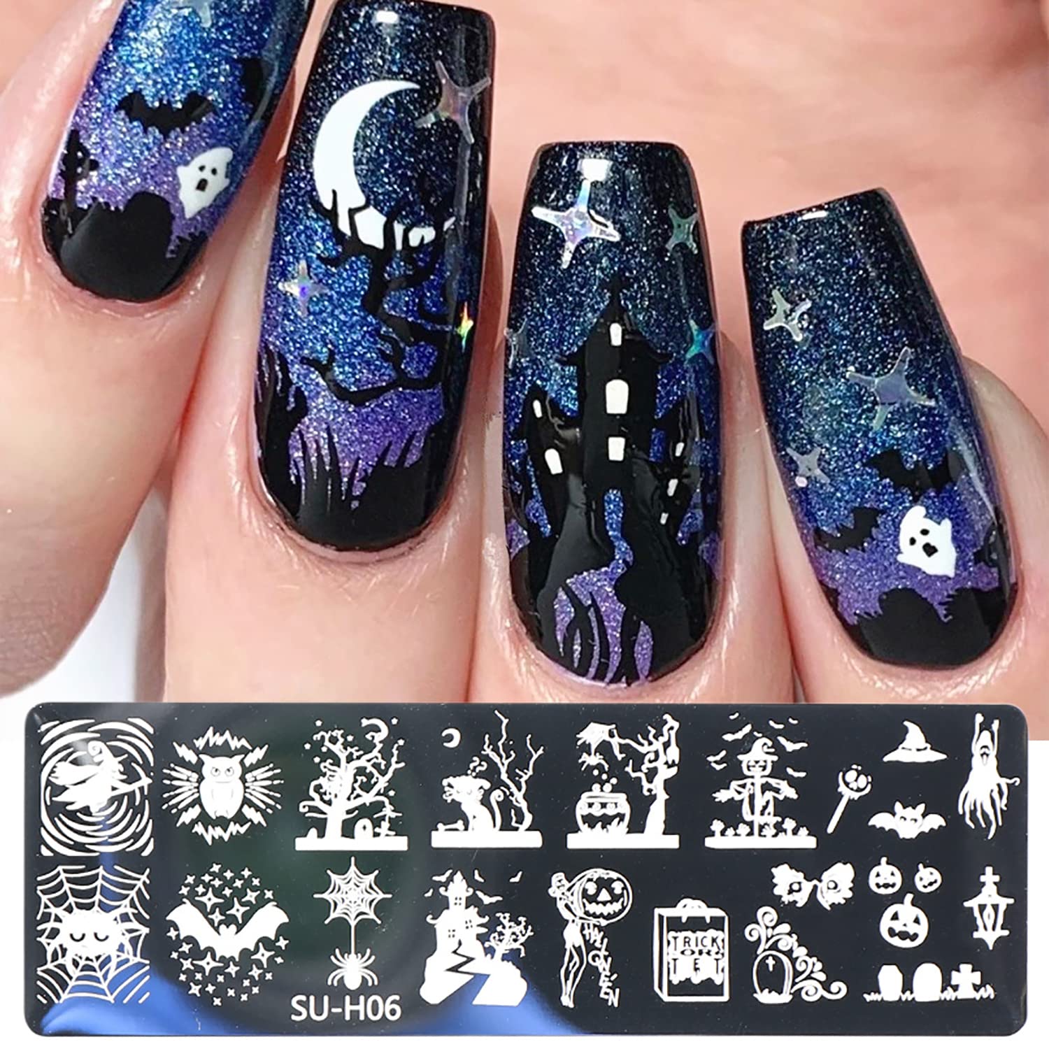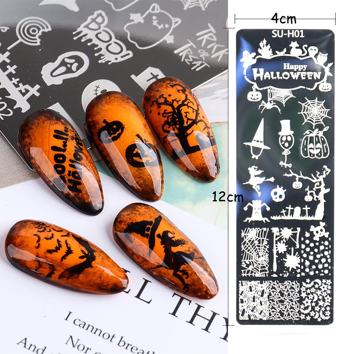 Description: Halloween Nail Art Stamping Templates Kit 6 Pcs Nail Art Image Plates Pumpkin Ghost Skull Bat Owl Spider Web Nail Designs Acrylic Nail Accessories for Halloween Nail Decorations Plates+1 Stamper+1 Scraper Packing Quantity: 6 pcs Nail Stamping Templates Plates+1 Stamper+1 Scraper Pattern: Pumpkin, Bat, Spider, Ghost, etc.