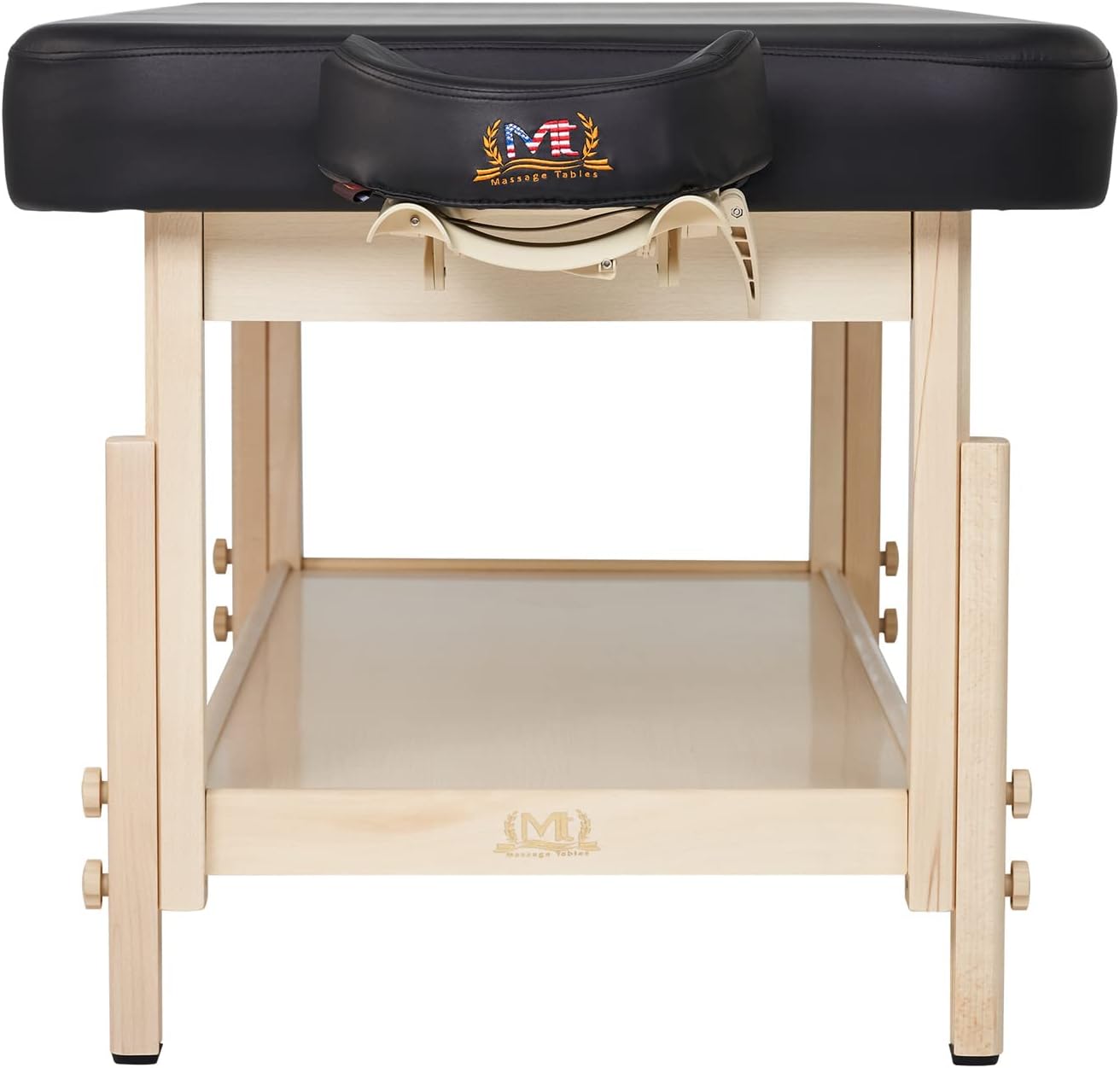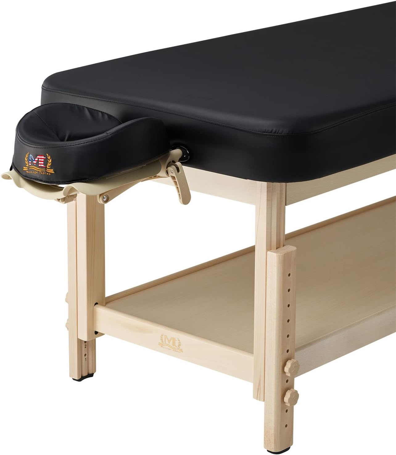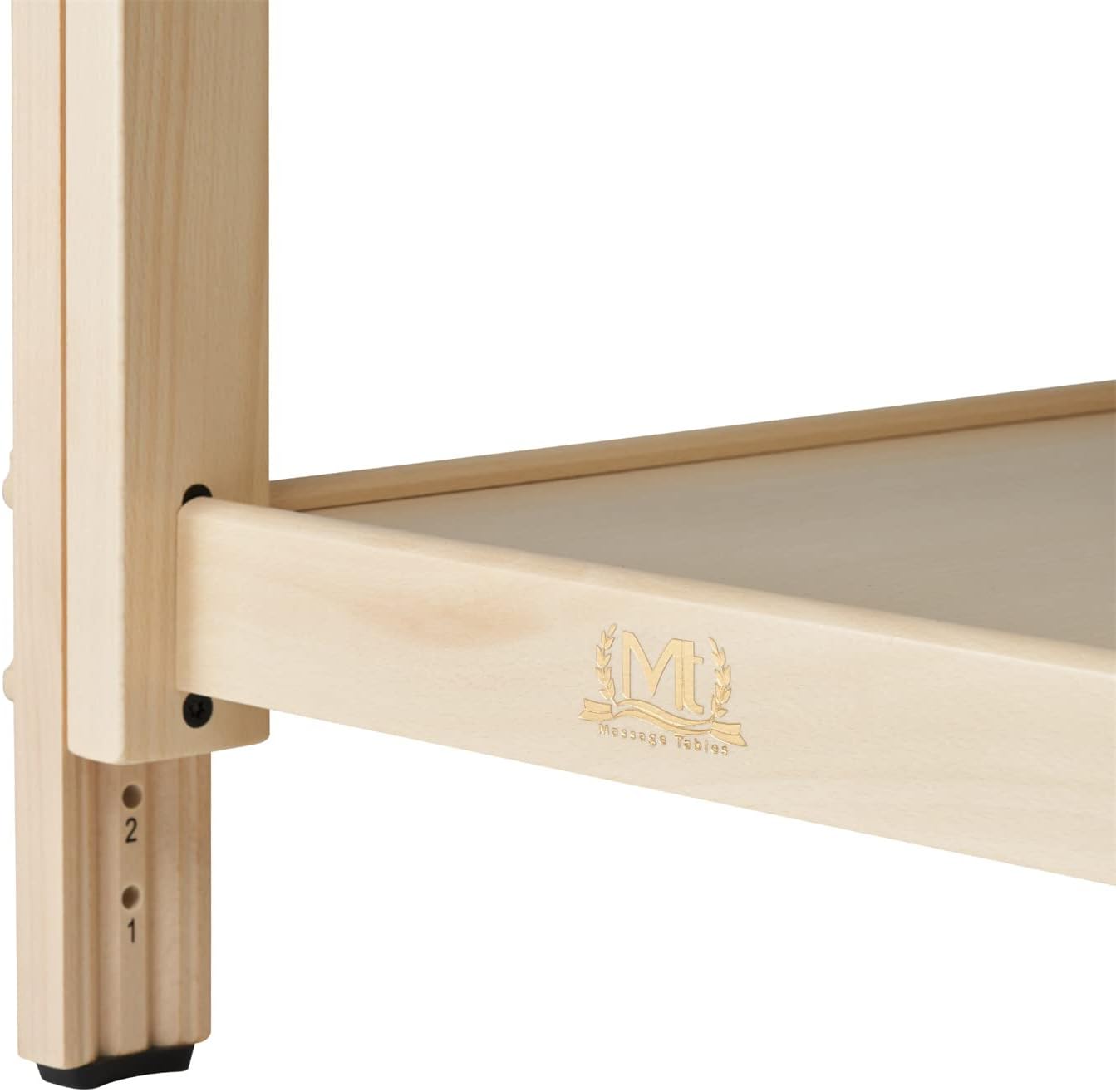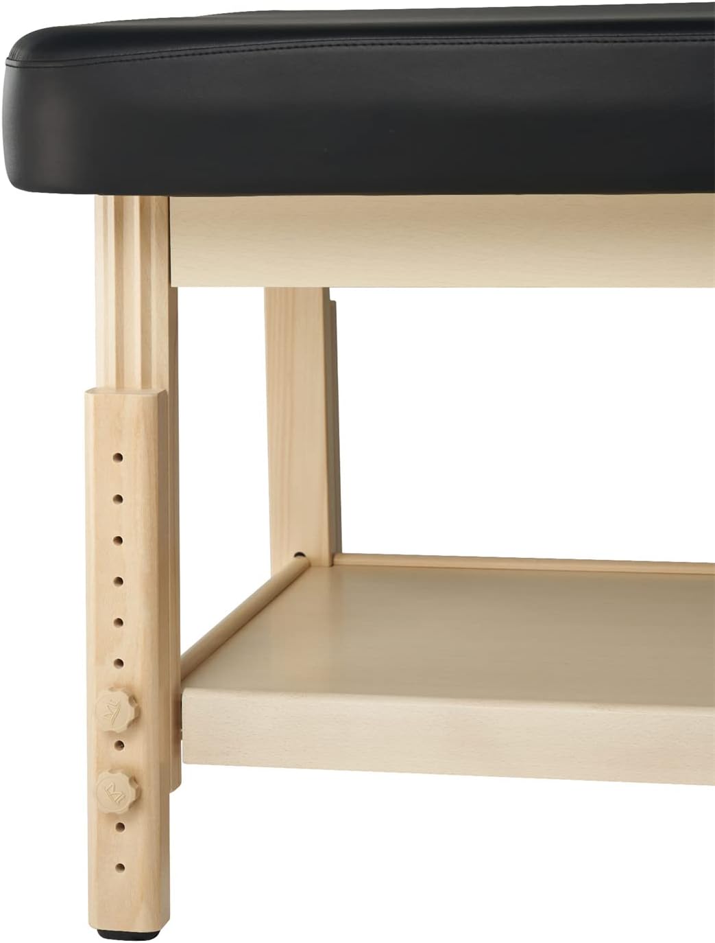 The table also features a heavy-duty open storage shelf for storing linens and towels.