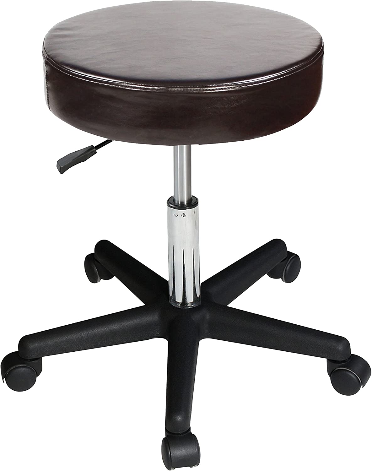 Our Adjustable Rolling Utility Stool boasts a large, comfortable swivel seat with pneumatic height adjustment; hypoallergenic upholstery; Elegant French Stitching; The hypoallergenic, CFC-free, oil and waterproof upholstery is backed by a 5 year guarantee, while the chair”s Five-Point dual swivel caster provides easy movement and extra stability.