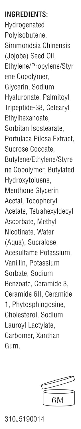 Hydrogenated Polyisobutene, Jojoba Seed Oil, Ethylene/Propylene/Styrene Copolymer, Glycerin, Sodium Hyaluronate, Palmitoyl Tripeptide-38, Cetearyl Ethylhexanoate, Sorbitan Isostearate, Portulaca Pilosa Extract, Sucrose Cocoate, Butylene/ Ethylene/Styrene Copolymer, Butylated Hydroxytoluene, Menthone Glycerin Acetal, Tocopheryl Ascorbate, Methyl Nicotinate, Water, Sucralose, Acesulfame Potassium, Vanillin, Potassium Sorbate, Sodium Benzoate, Ceramide 3, Ceramide 6 II, Ceramide 1, Phytosphingosine, Cholesterol, Sodium Lauroyl Lactylate, Carbomer, Xanthan Gum