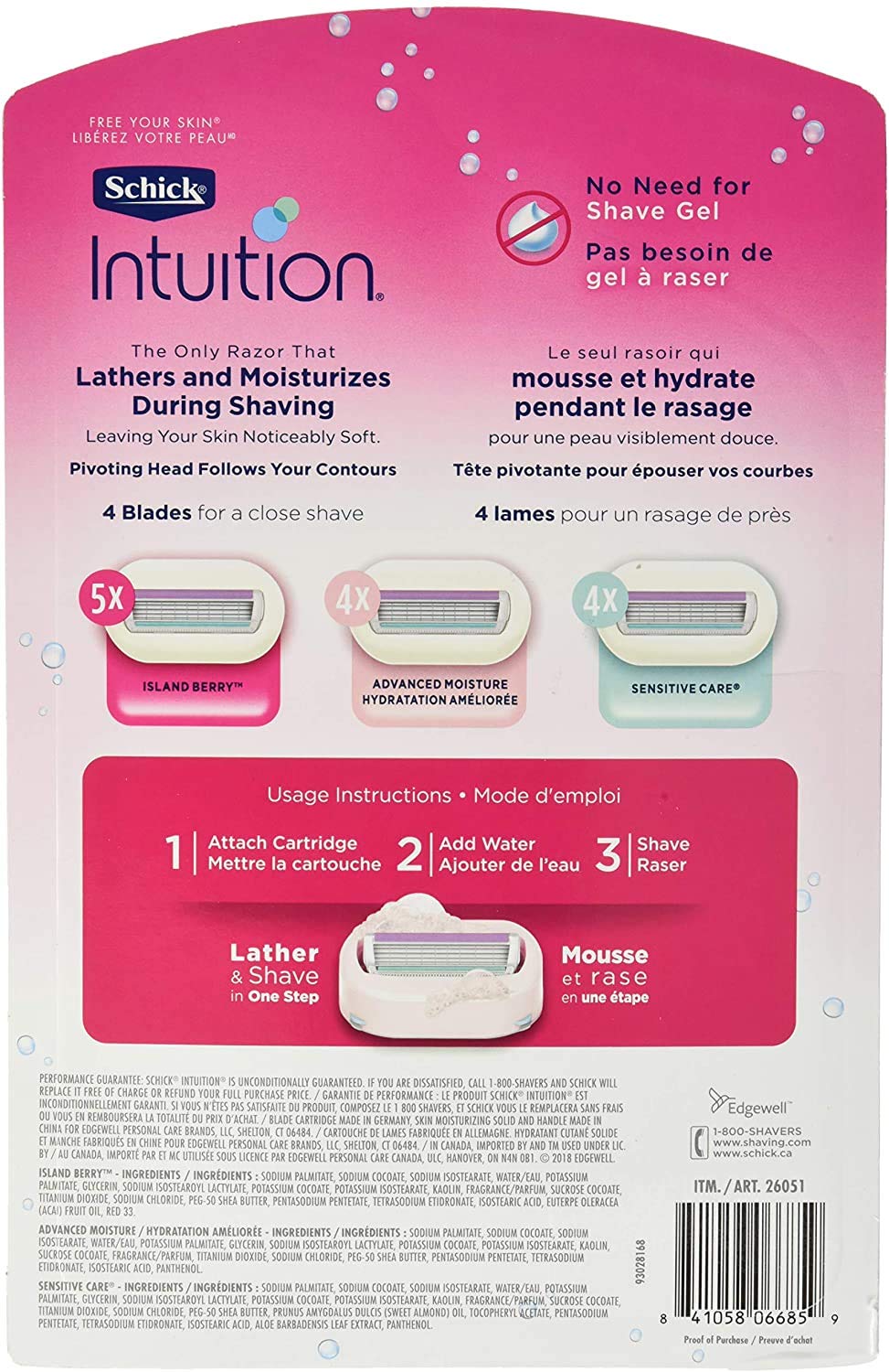 Schick Intuition Variety Pack 13 Refills w/ Razor Handle This pack includes: 5 pure nourishment coconut milk and almond oil cartridges 4 advanced moisture shea butter cartridges 4 sensitive care aloe and vitamin E cartridges 13 cartridges total 1 razor handle