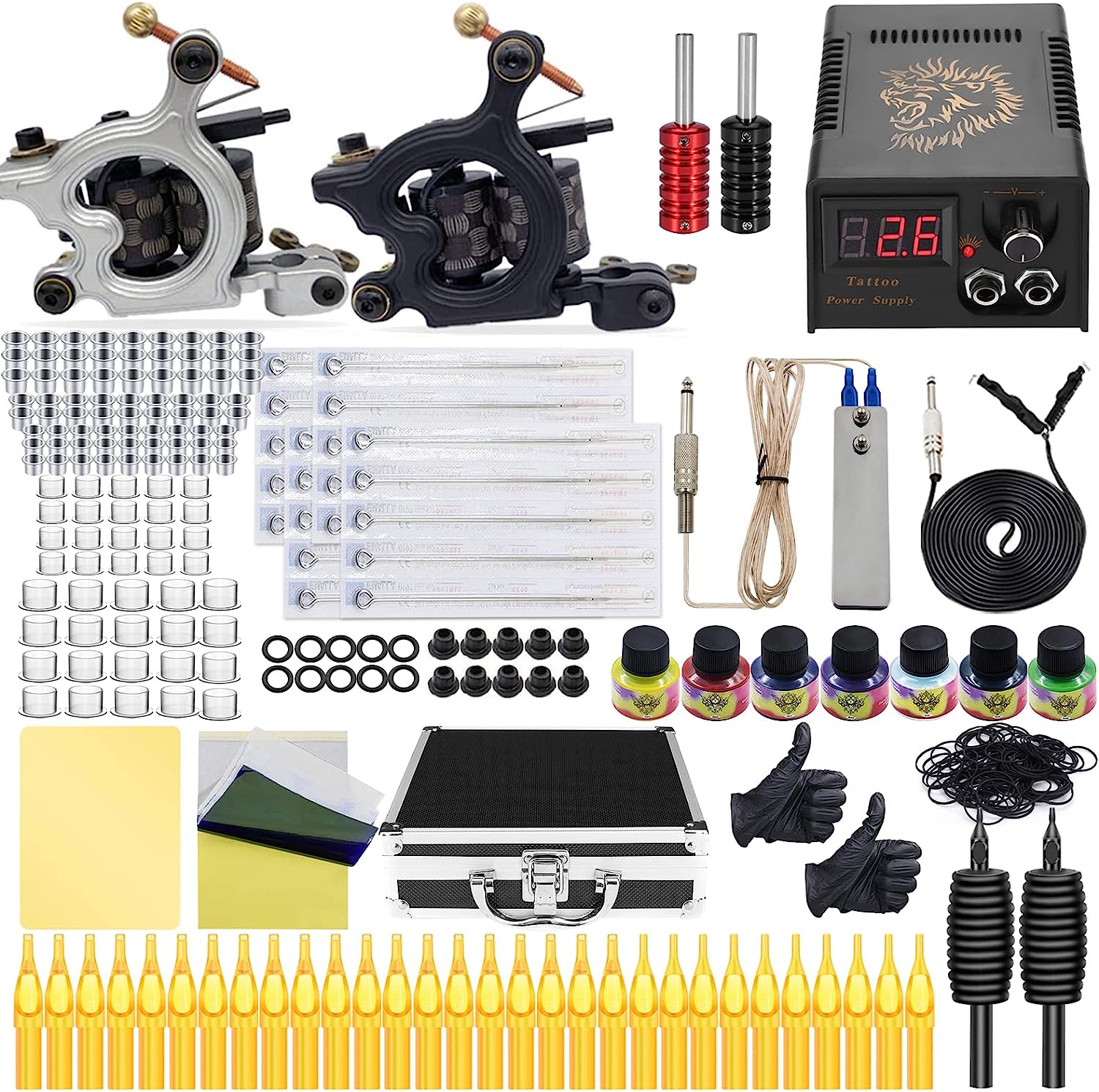 [COMPLETE KIT PROFESSIONAL]- complete kit for beginners, Including rotary machine, 1pcs power supply with cable, 100pcs assorted sizes cartridge needles, 10pcs fake skin, 1pcs tape wrap, 200pcs pen covers, 20pcs ink cups, 7pcs ink and other tattoo accessories.