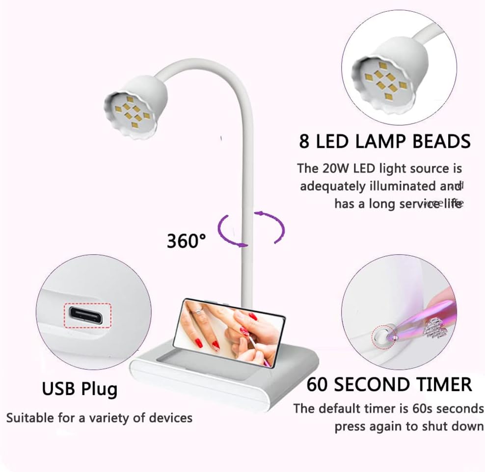 LED Nail Curing Lamp with Phone Holder, 20W Portable Nail Dryer for Gel Nail Polish, Poly Builder Nail Gel, Glue Gel,360° Rotatable Hands Free Quick Dry Nail Light for Home DIY