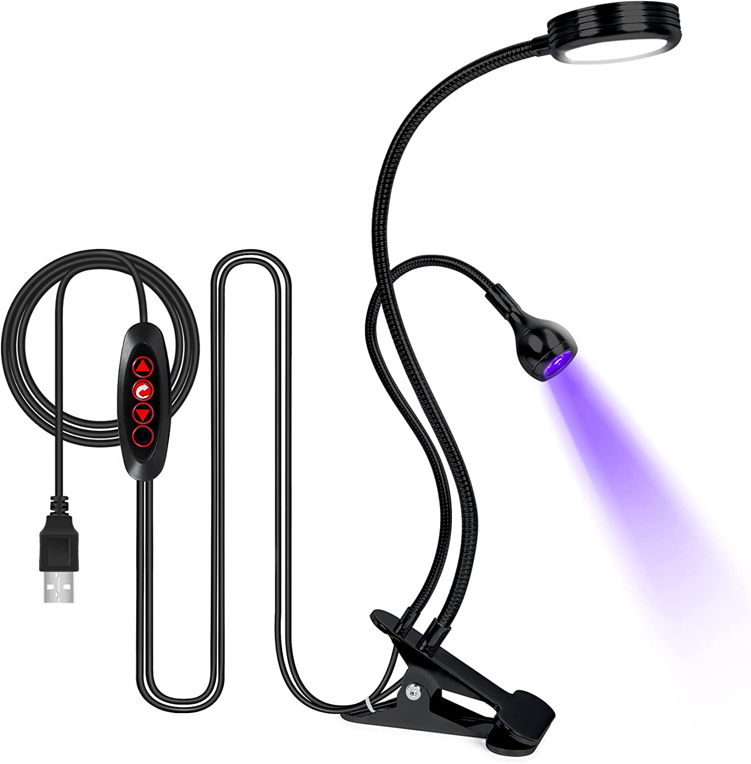 UV light for nails is made of aluminum alloy, with 3W led lamp beads, double heads (Led Light & UV Lamp), 360 degrees freely angle gooesneck and securing clip,suitable for lamp nail polish, repairing phones, fluorescent paint, resin art, ultraviolet curing, black light posters, stain detection and glow party, fluorescent agent detection and fluorescent banknote.