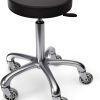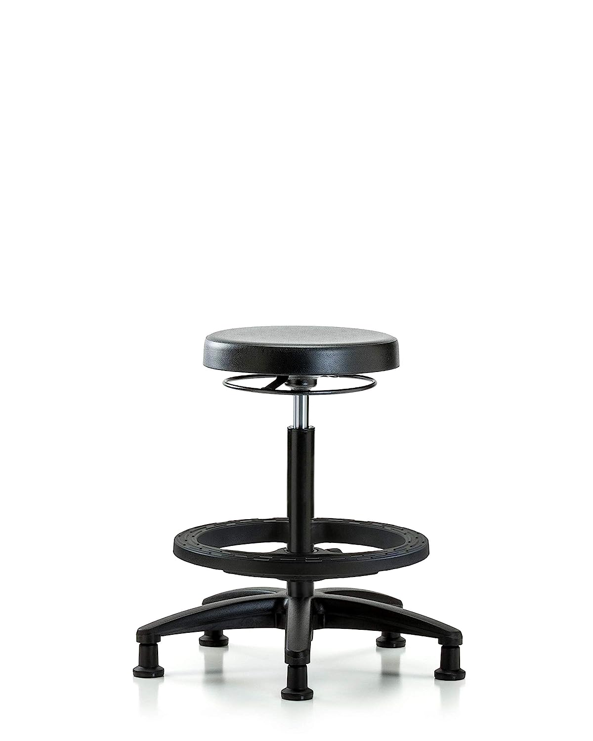 Black Polyurethane High Bench Height Stool is adjustable from 22-32 inches from the top of the seat to the floor and features 360-degree, all-around control, black nylon adjustable foot ring, and black, nylon-reinforced fiberglass base with stationary, non-marring glides suitable for hard floors in chemical, soil, and puncture resistant polyurethane.