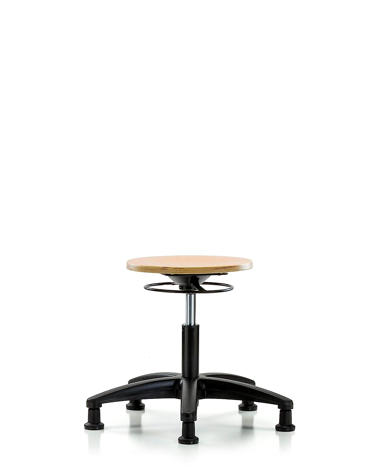 Wood Desk Height Stool is adjustable from 16-21 inches from the top of the seat to the floor and features 360-degree, all-around control and black, nylon-reinforced fiberglass base with stationary, non-marring glides suitable for hard floors in 7-ply furniture grade hardwood with natural finish.
