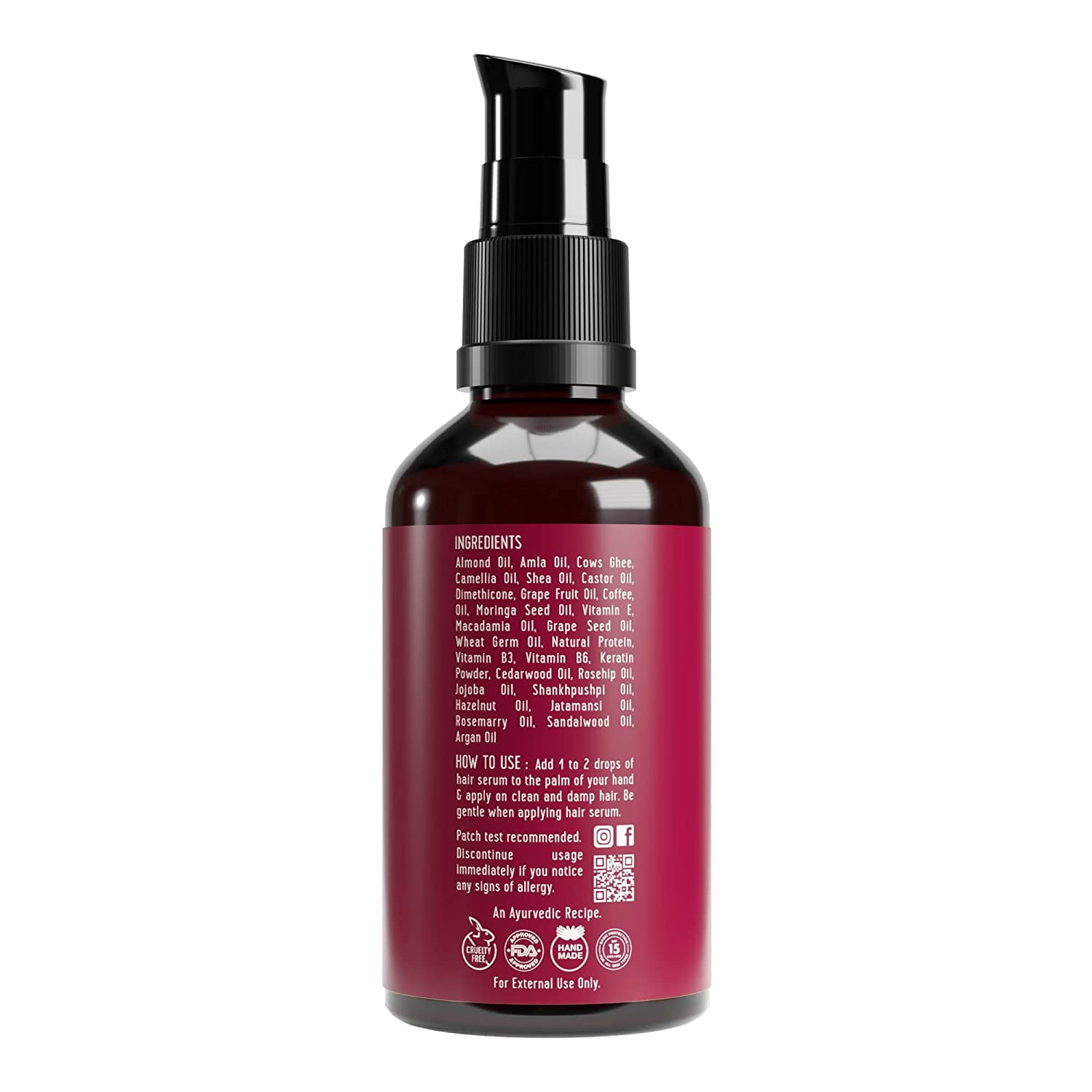 Ingredients Cow”s Ghee, Vitamin E, Vitamin B3, Vitamin B6, Keratin Protein, Argan Oil, Macadamia Oil, Almond Oil, Camellia Oil, Shea Oil, Grape Seed Oil, Grape Fruit Fermentors, Moringa Seed Oil, Wheat Germ Oil, Cedarwood Oil, Rosemarry Oil, Amla Oil, Rosehip Oil, Jatamansi Oil, Shankhpushpi Oil, Sandalwood Oil, Jojoba Oil, Hazelnut Oil, Coffee Oil, Castor Oil, Natural Protein, Dimethicon How to Use Add 1 to 2 drops of hair serum to the palm of your hand.