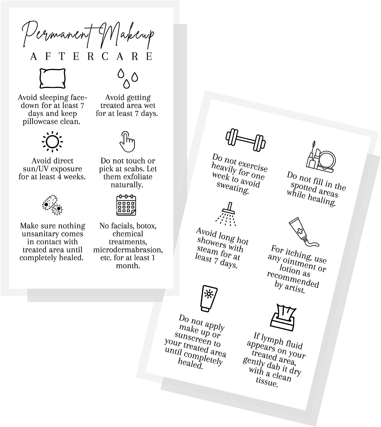 Printed front and back with permanent makeup PMU aftercare instructions.