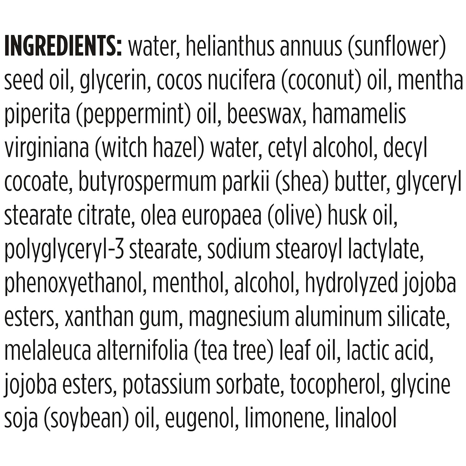Water, helianthus annuus (sunflower) seed oil, glycerin, cocos nucifera (coconut) oil, beeswax, mentha piperita (peppermint) oil, stearic acid, hamamelis virginiana (witch hazel) water, mentol, sodium bicarbonate, melaleuca alternifolia (tea tree) leaf oil, petroselinum crispum (parsley) leaf oil, triticum vulgare (wheat) germ oil, citrus aurantium dulcis (orange) peel wax, rosmarinus officinalis (rosemary) leaf extract, tocopherol, sucrose stearate, xanthan gum, canola oil, sodium borate, alcohol, phenoxyethanol, limonene, linalool