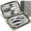 Our nail clipper kit comes with a leather case, Set includes Olecranon toenail clipper,Nail Clipper, Oblique Clipper,Eyebrow trimming scissors,Nail File, Eyebrow Tweezer, Dead skin fork, Ear scoop.