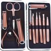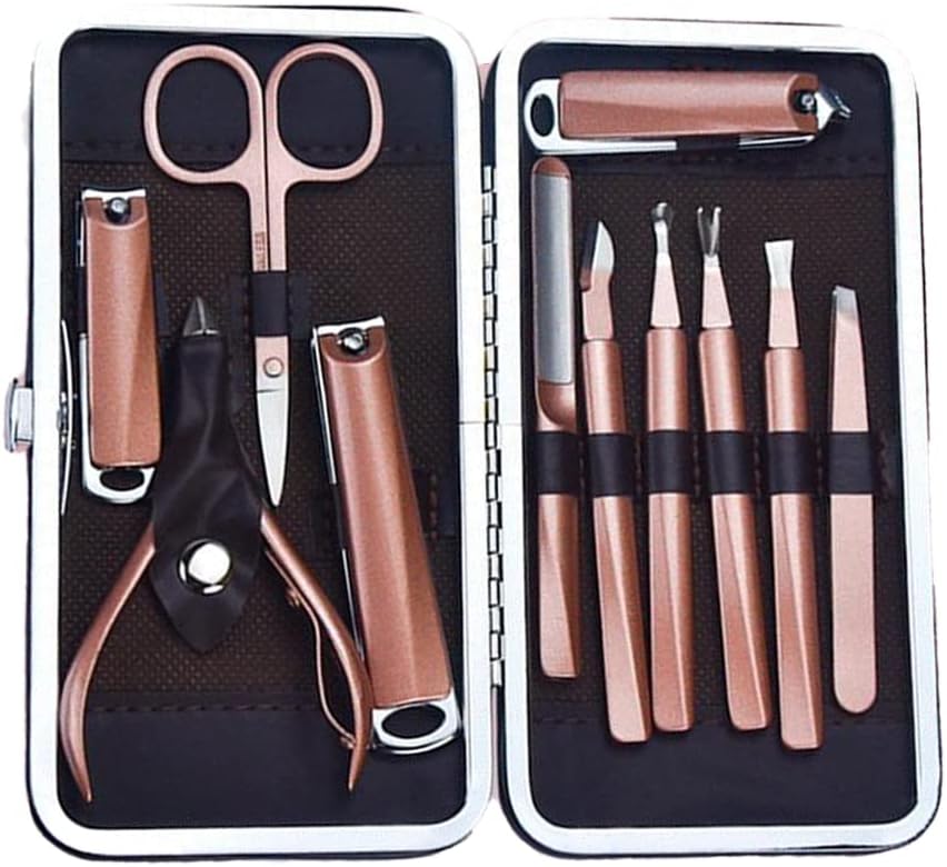 The 11-piece manicure and beauty kit includes:Large nail clippers: strong grip, trim hard and thick toenailsMedium nail clippers: trimmed small and medium nailsDiagonal nail clippers: trim the corners of the nails and remove the cornsNail file: polish the manicured nails and smooth the edges of the nailsDead skin pliers: used to trim the surface, calluses, dead skinDead skin push: V-shaped cutting edge, push and scrape the dead skin around the nailDouble-end cleaning knife: the head is smooth and the dirt on the edge of the nail is removedScraper: essential for manicure, shave nail polish and thick nailsEar digging spoon: rounded spoon head, comfortable and not hurt the earEyebrow scissors: the design of the radian trimmer makes it easier to trimEyebrow clip: elastic design, high occlusion, easy to remove small hairThis product uses high quality stainless steel material, rose gold color, with leather bag, and novel design, which is both stylish and practical, meet everyone”s needs, is an excellent choice for gift.