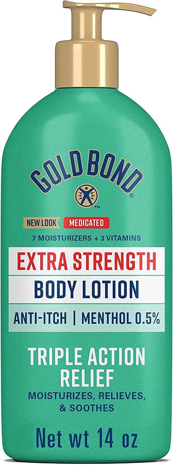 Gold Bond Extra Strength Medicated Lotion is great for relieving pain and itching associated with minor skin irritations, such as sunburn, insect bites, and minor burns, cuts, and scrapes.