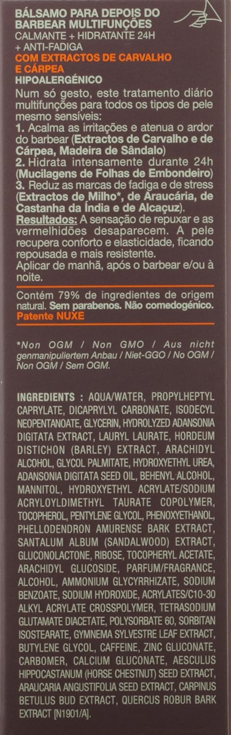 In a single application, this Multi-Purpose After-Shave Balm enables: 1/ Soothing and anti-irritation action. The hydrolipidic film is restored (Sandalwood and Phellodendron). The skin”s barrier function is repaired (Extracts of Oak and Hornbeam). 2/ 24HR moisturizing action (Baobab Leaves). 3/ Invigorating action (Aracauria Extract – patent). 4/ An “anti-regrowth” action for the hair (Extract of Gymnema Sylvestre).