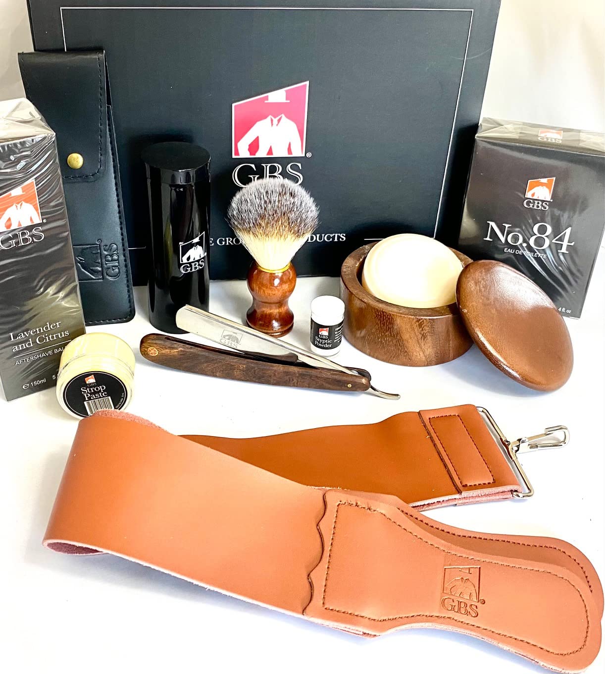 S Men”s Shaving Set- Wet Shaving Set with Razor, Ceramic Bowl, Soap & synthetic Brush with Stand, wood straight razor, Leather case ,Wood bowl, Aftershave Balm and Eau De Toilette, Strop Paste!Experience the G.