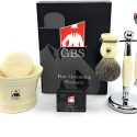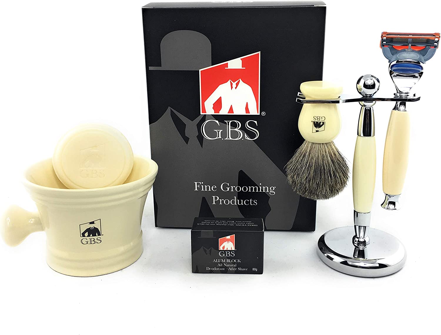 Men”s Shaving Set Includes Five Blade Razor, Synthetic Brush & Razor Dual Stand, Ivory Shaving Mug with 97% All Natural Shaving Soap & an Alum Block