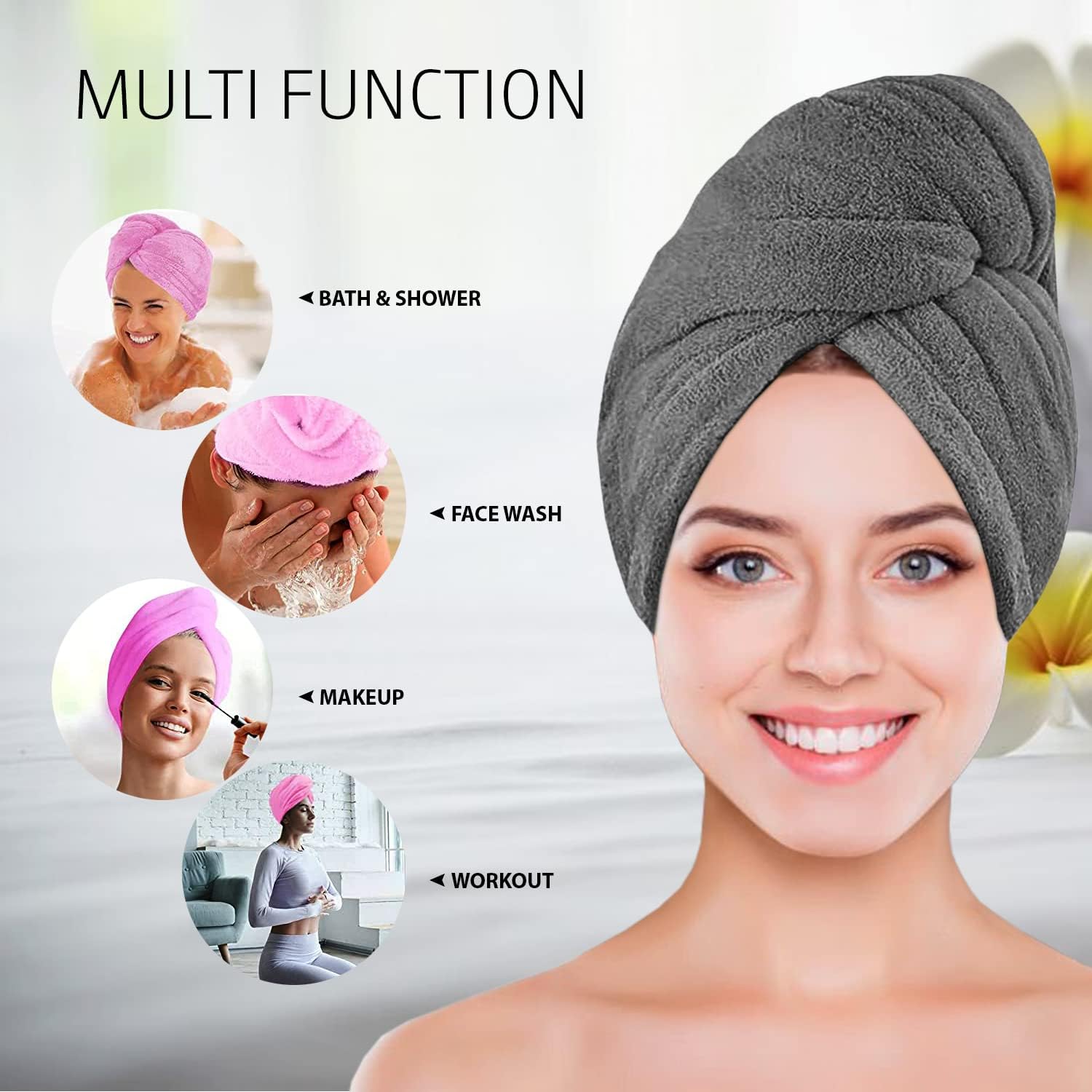4-pack Microfiber hair wraps for women wet hair in two astounding colors featuring purple & Grey with a size of 65 x 25cm are created with ultra-absorbent, odorless microfiber fabric for swift drying.