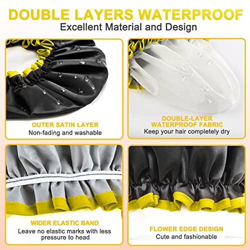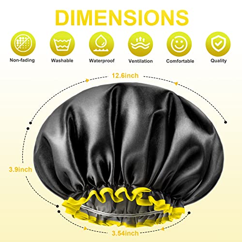 Double Layers Waterproof: mikimini shower cap is a double-layer design with a waterproof EAV inner layer and satin outer layer, which keeps your hair completely dry in the shower and avoids water seeping in through the sides and back. The elastic band of the black shower cap scrunches together well to keep water out.
