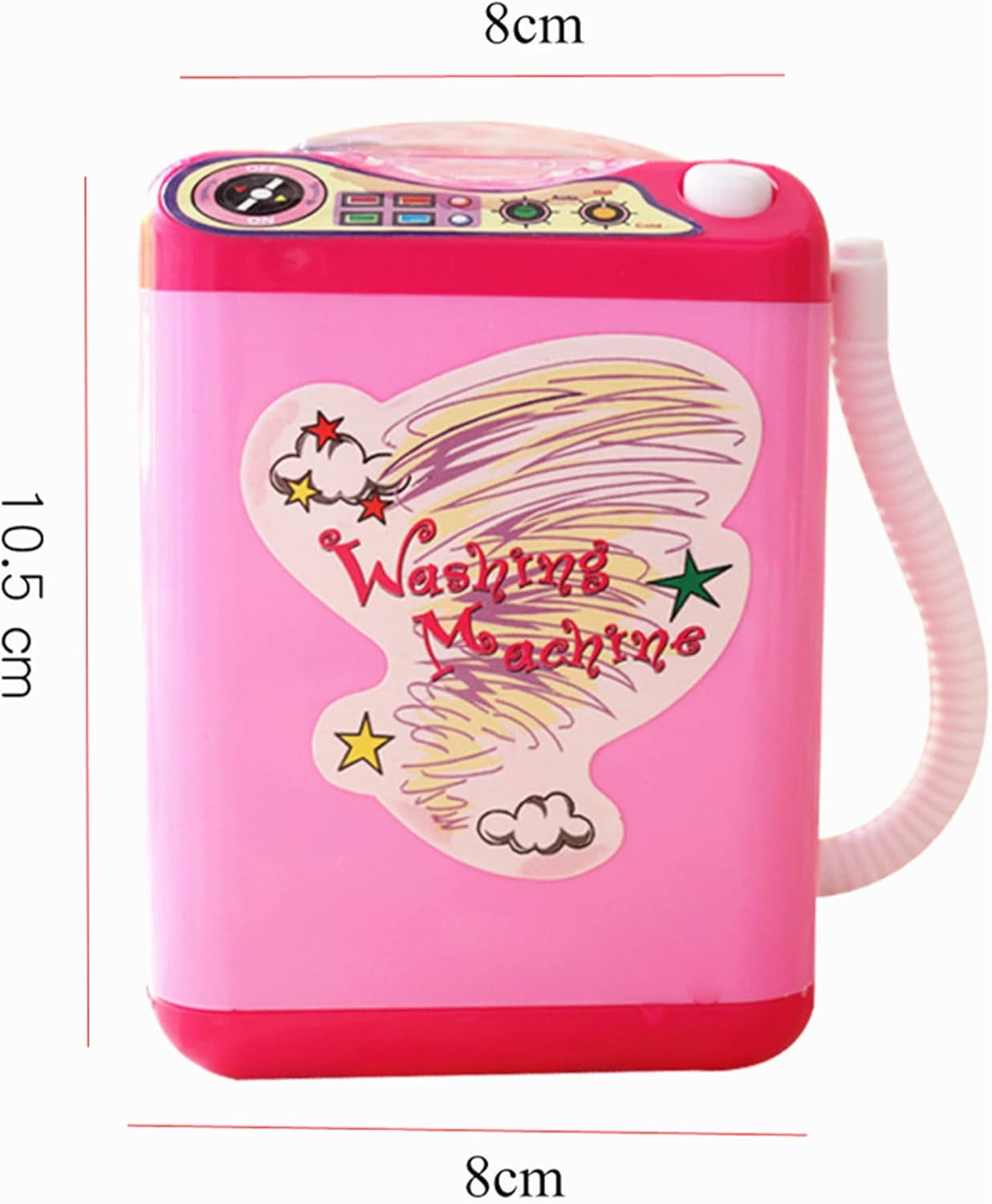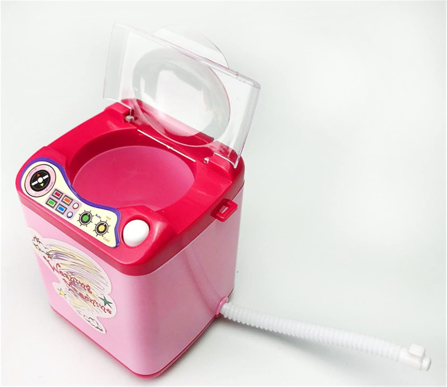 This toy washing machine is only suitable for cleaning small items, large powder puff or brush will slow down the speed of the product.