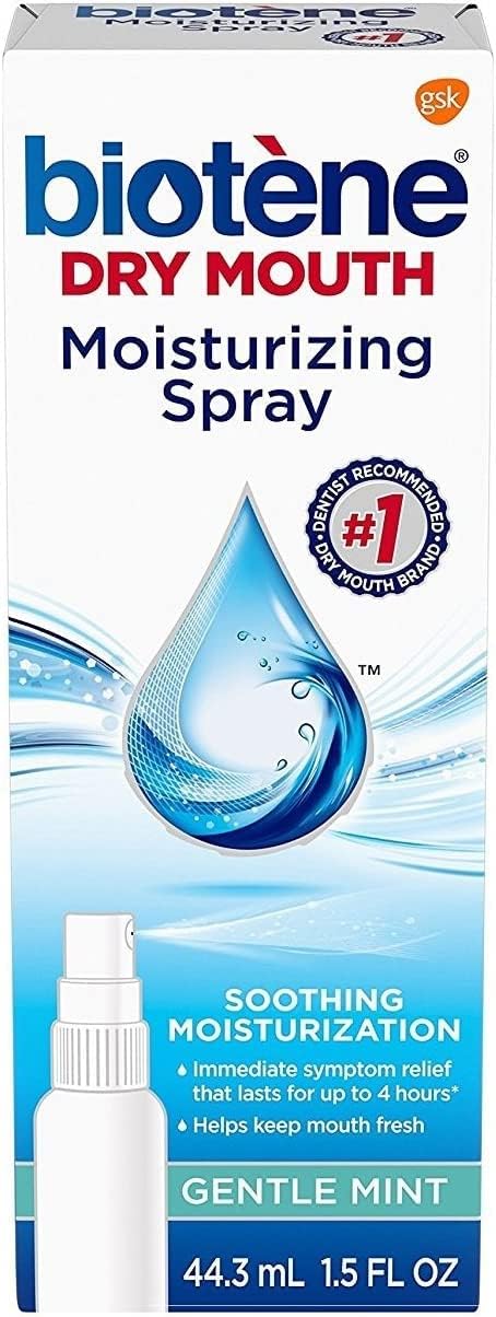 Biotene Moisturizing Spray Gentle Mint provides a quick, on-the-go solution that gives dry mouth symptom relief.