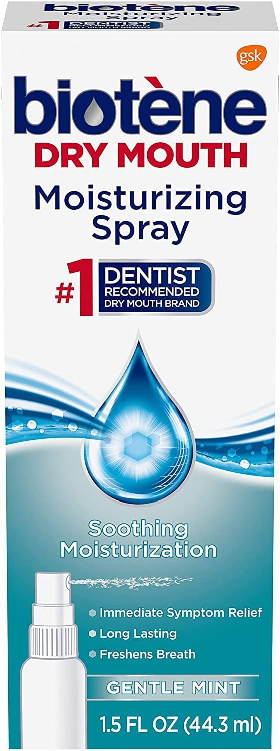 Biotene Moisturizing Spray Gentle Mint provides a quick, on-the-go solution that gives dry mouth symptom relief.