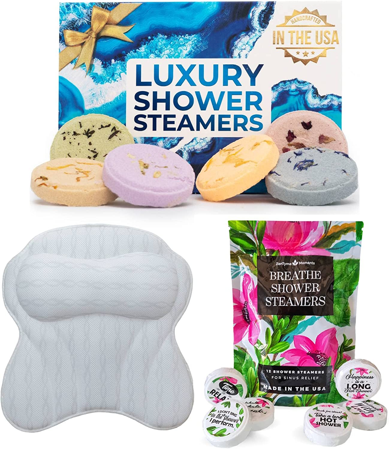 Create your own luxury, at-home spa experience! This set includes one Luxury Bath Pillow, one 12-Pack Eucalyptus Shower Steamer pack, and one 6-Pack Shower Steamer gift set.