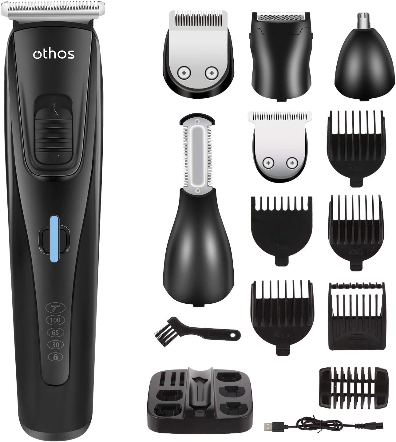 [11-in-1 Multi-functional Grooming Kit] Othos MG6561 series multi-functional grooming hair clippers kit including hair cutting trimmer, foil shaver, beard trimmer, bi-directional body trimmer, nose trimmer, 4 hair trimmer guide combs(3/6/9/12mm), adjustable body trimmer comb(6/9/13mm), adjustable beard trimmer comb(1-4mm). 11 switchable head are designed for all your daily personnel grooming needs. This is also the best gift for your loved ones.
