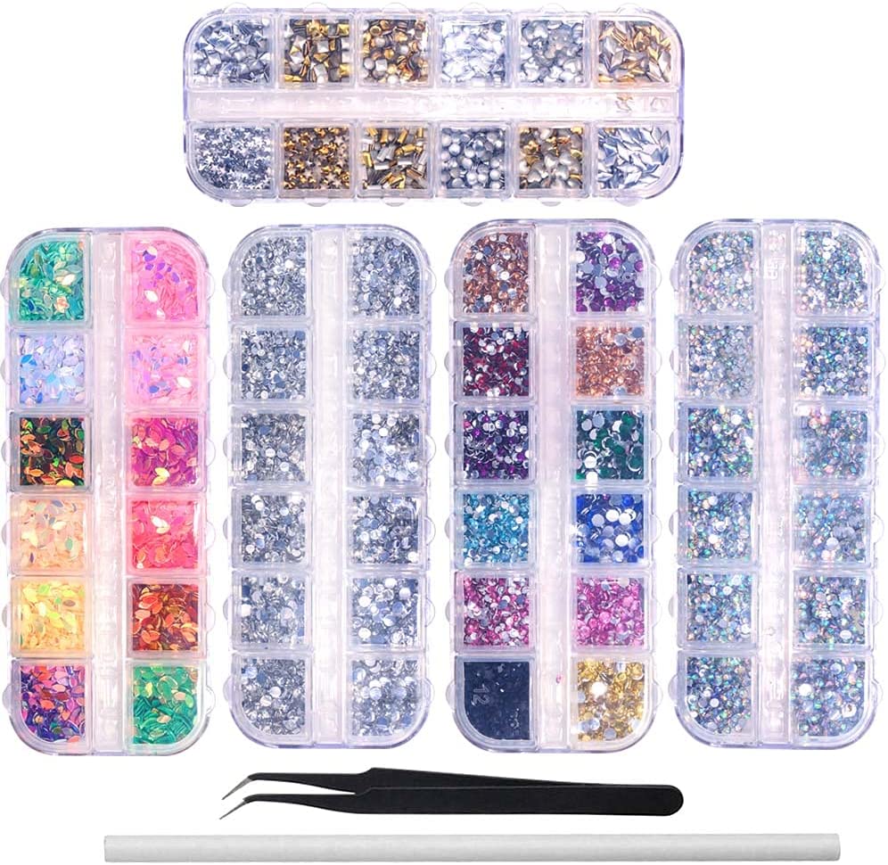 6400pcs Nail Art Rhinestones Kit Nail Crystal Gems Nail Diamonds, Gold Silver Nail Art Studs Colorful Nail Rhinestones and Horse Eyes Sequins in 5 Boxes, Mixed AB Rhinestones for Nails Kit with Tweezers and Wax Pen for Nail Art Supplies Accessories.