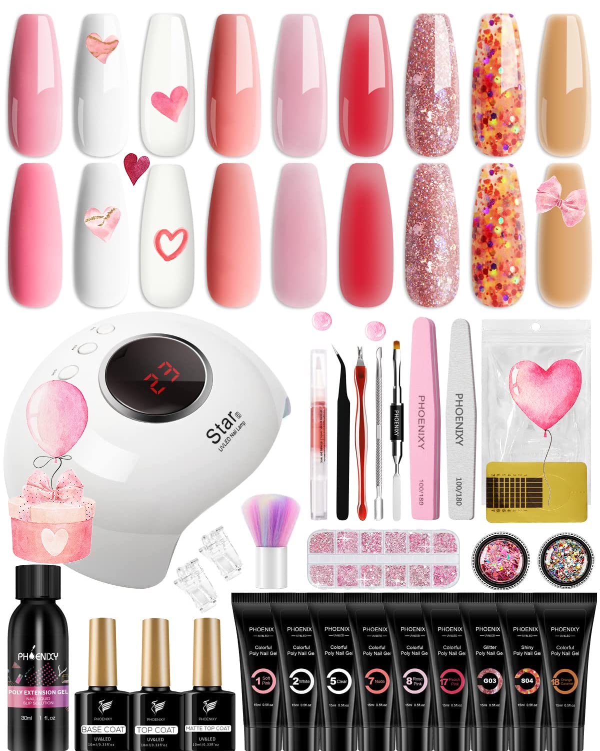 Nail Gel Kit, Phoenixy 9 Colors Poly Extension Nail Gel with 36W U V LED Nail Lamp Poly Nail Extension Gel Starter Set with Manicure Tools Gift for Women