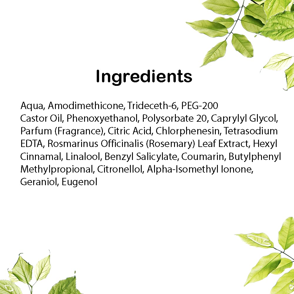 Aqua, Amodimethicone, Trideceth-6, PEG-200 Castor Oil, Phenoxyethanol, Polysorbate 20, Caprylyl Glycol, Parfum (Fragrance), Citric Acid, Chlorphenesin, Tetrasodium EDTA, Rosmarinus Officinalis (Rosemary) Leaf Extract, Hexyl Cinnamal, Linalool, Benzyl Salicylate, Coumarin, Butylphenyl Methylpropional, Citronellol, Alpha-Isomethyl Ionone, Geraniol, Eugenol