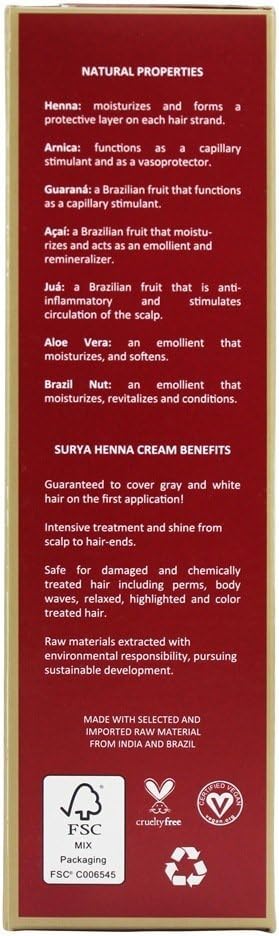 31 oz CreamProduct DescriptionWinner of the Best of Natural Beauty Awards, Surya Brasil”s high performance Henna Cream Color is an anti-oxidant rich semi-permanent hair color that infuses hair with lush, vibrant color while nourishing with sustainably harvested botanicals.