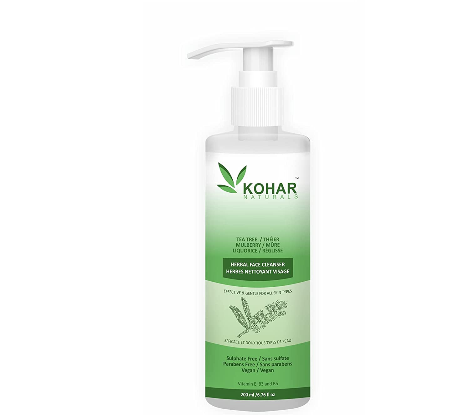 KOHAR NATURALS Herbal Face Cleanser is SLS (Sulphate) Free, Phthalate Free, Parabens Free, Alcohol Free, Non-irritating (pH balanced), Non-comedogenic, 100% Vegan & Cruelty Free, Hydrating Formula contains herbal ingredients (Tea Tree, Liquorice, Mulberry and Aloe Vera) infused with vitamins E, B3 and B5.
