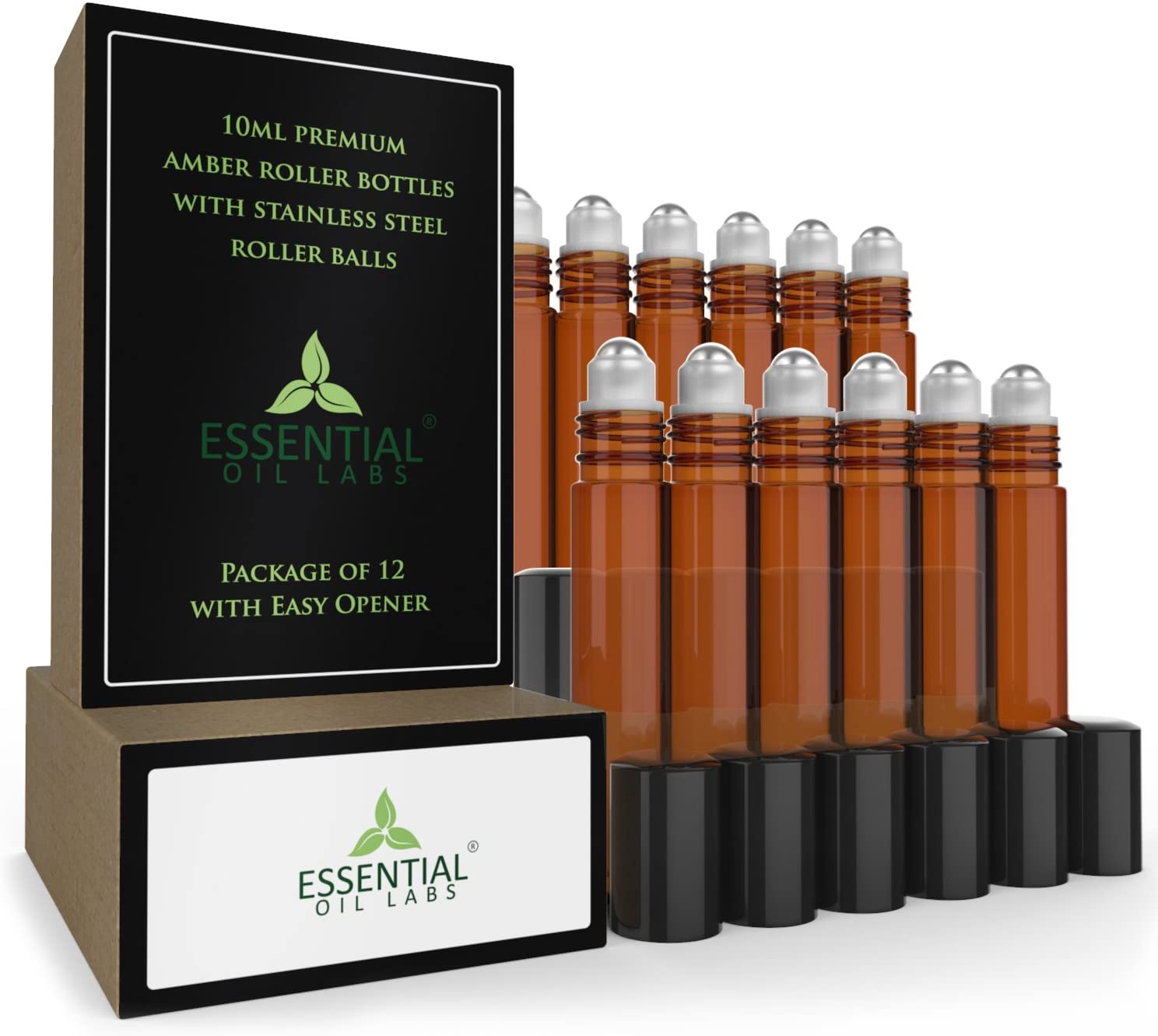 Oil Roller Bottles, 10 ml Amber Glass Roll-On Bottles with Stainless Steel Roller Balls and Easy Opener Tool, Set of 12