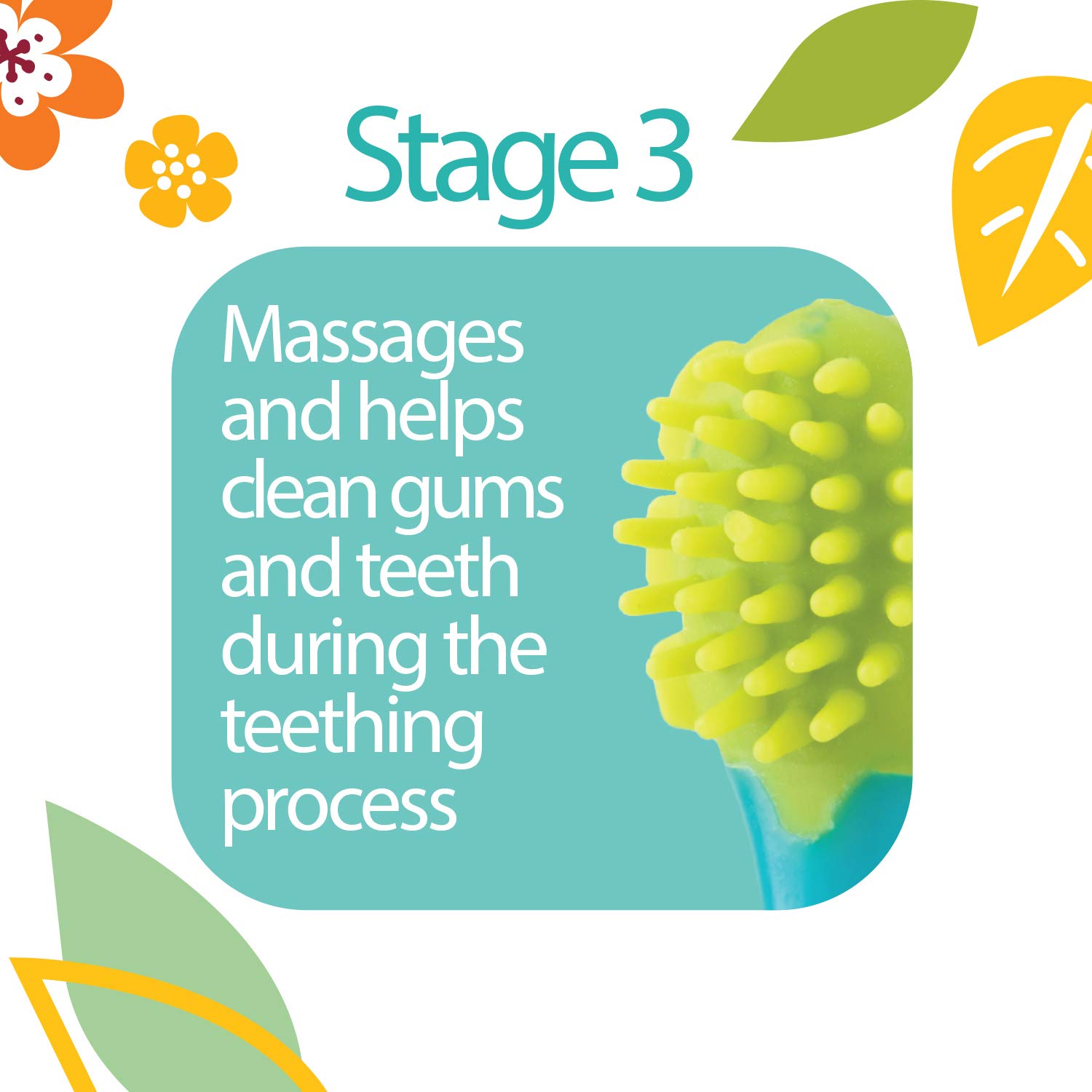 The stage 1 silicone massager allows parents to brush and massage gums gently, while stage 2 massaging brush gently cleans new teeth as they emerge.