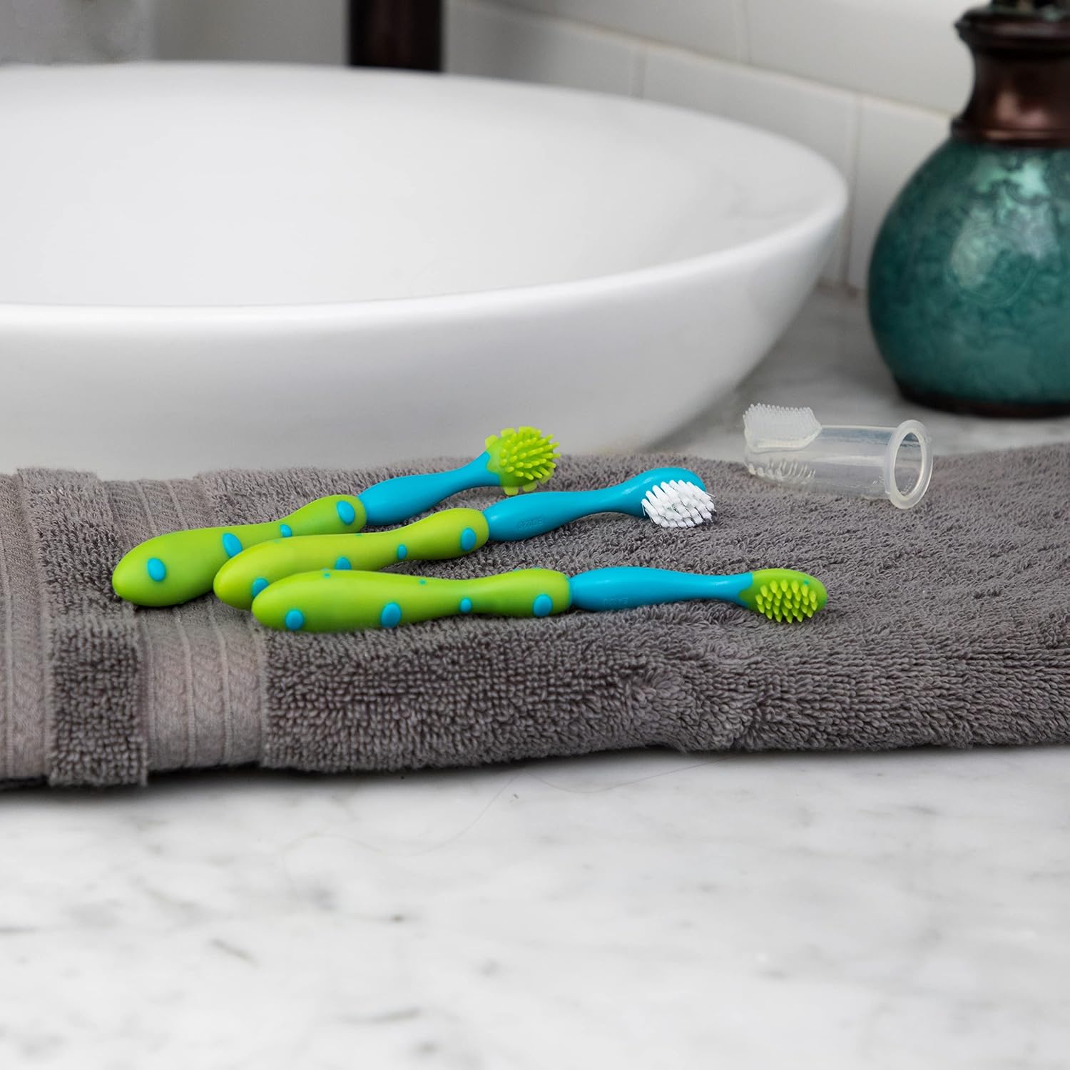 | Care instructions | Brushes become worn. It is very important to replace brushes every 3 to 4 months. Stage 1 silicone massager is designed for babies under 3 months of age. Slip massager onto adult’s finger, and gently massage along child’s gums in small circles. After brushing, carefully clean the gums with a damp washcloth or gauze pad. Stage 2 massaging brush is designed for babies over 3 months of age. Brushing should be done after feeding and at bedtime and should last for 2 to 3 minutes. |