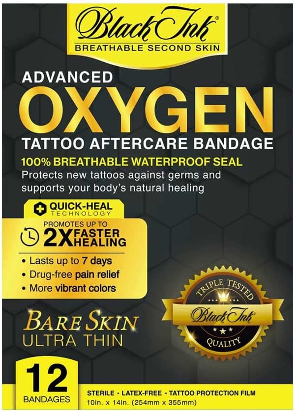 PROTECT YOUR NEW TATTOOS with Black Ink Advanced OXYGEN tattoo bandage! The thinnest & strongest tattoo skin wrap on the market, OXYGEN creates a micro-thin protective layer that shields your work from the elements and offers natural relief from pain! The OXYGEN tattoo healing wrap is easy to apply and comfortable to wear, providing both optimal protection and comfort during the crucial early stages of tattoo aftercare. OXYGEN is so soothing and natural-feeling, it”s like there”s nothing there!