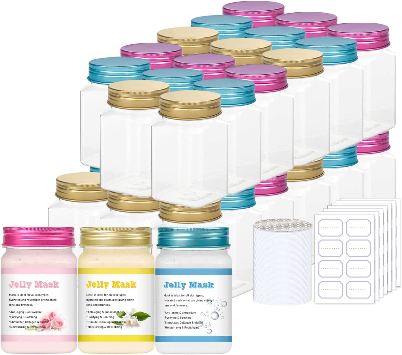 35 pack 12 oz Clear plastic square jars with seal liners,metal lids and waterproof labels.(Gold & Rosegold & Sky blue)