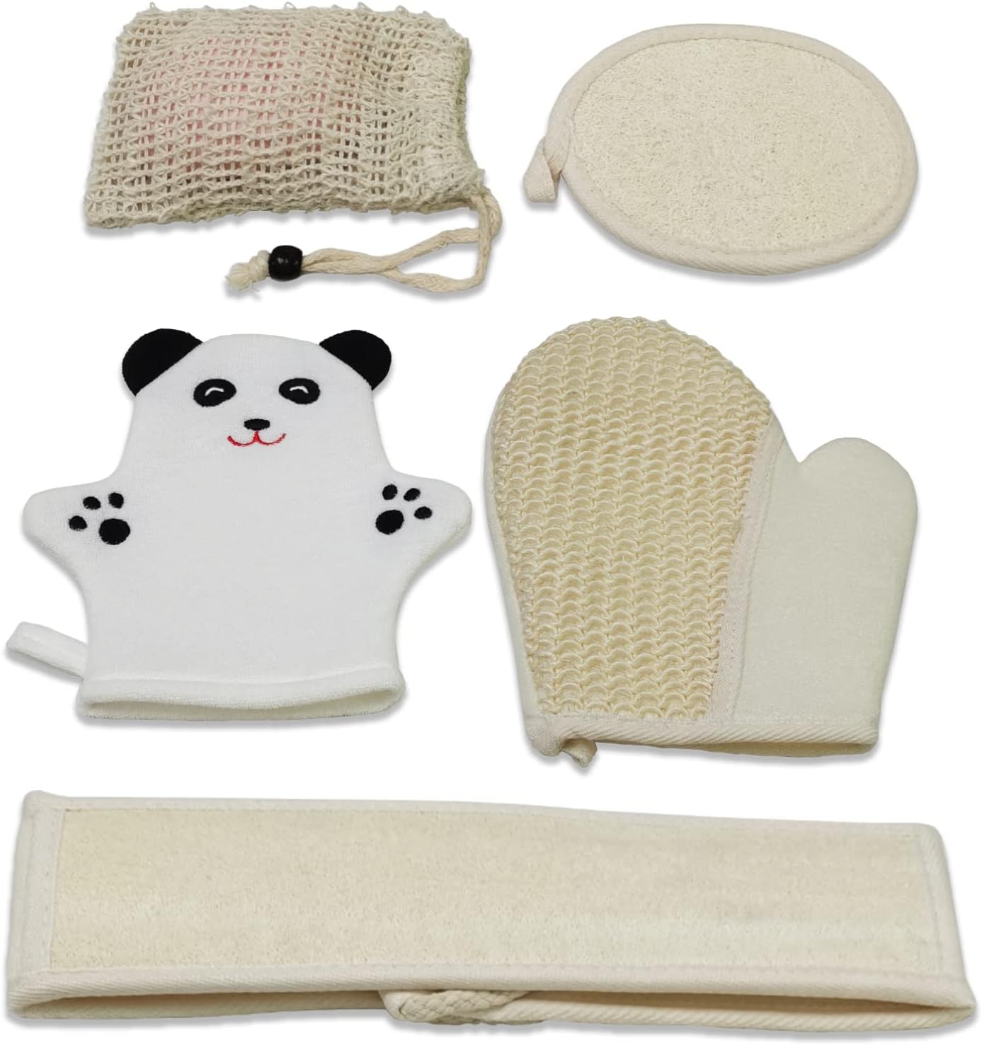 Economic Family Pack: 5 Pack Natural Loofah Bath Set for Adult & Children. Include: 1*Loofah Sponge Pad, 1*Loofah Back Strap, 1*Sisal Bath Glove, 1*Kids Bath Glove, 1*Soap Saver Bag.