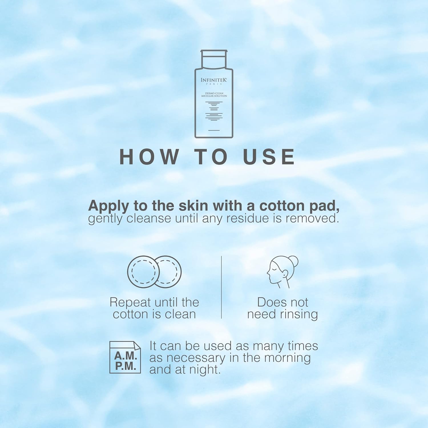 What does it do to the skin?: Ininitek Paris Dermo Clean Micellar Solution, gently removes make-up and impurities, while toning, hydrating and revitalizing the skin.