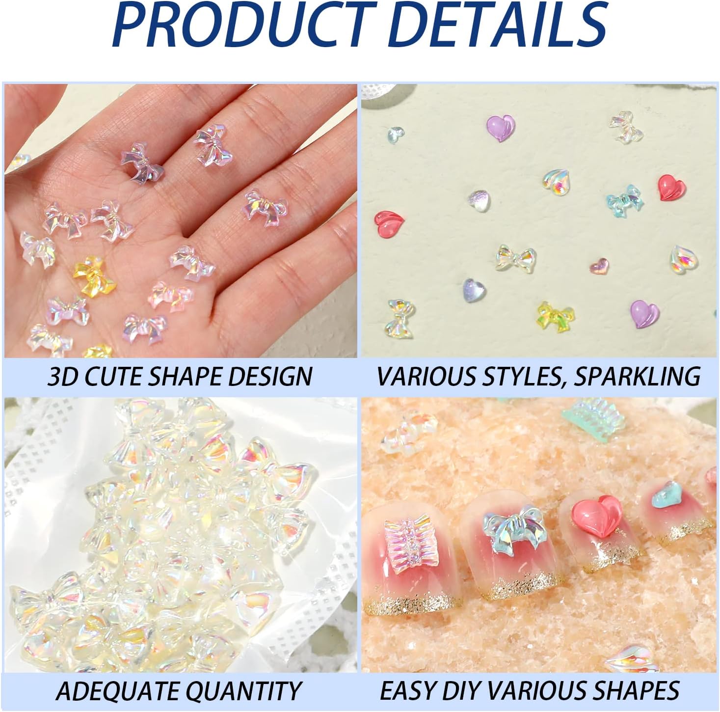 Describe:Product Name: 180pcs 3D cute nail charmsColor: 7 stylesStyle: 180pcs in totalMaterial: ResinShape: Bowknot, Heart, Peach, SkirtFeatures: 3D shape, sturdy and durable, glitter, exquisite, DIY decorationnail charm Applicable: Decorate nails, also suitable for hair clips, photo frames, scrapbooking, mobile phone cases, makeup art, etc.