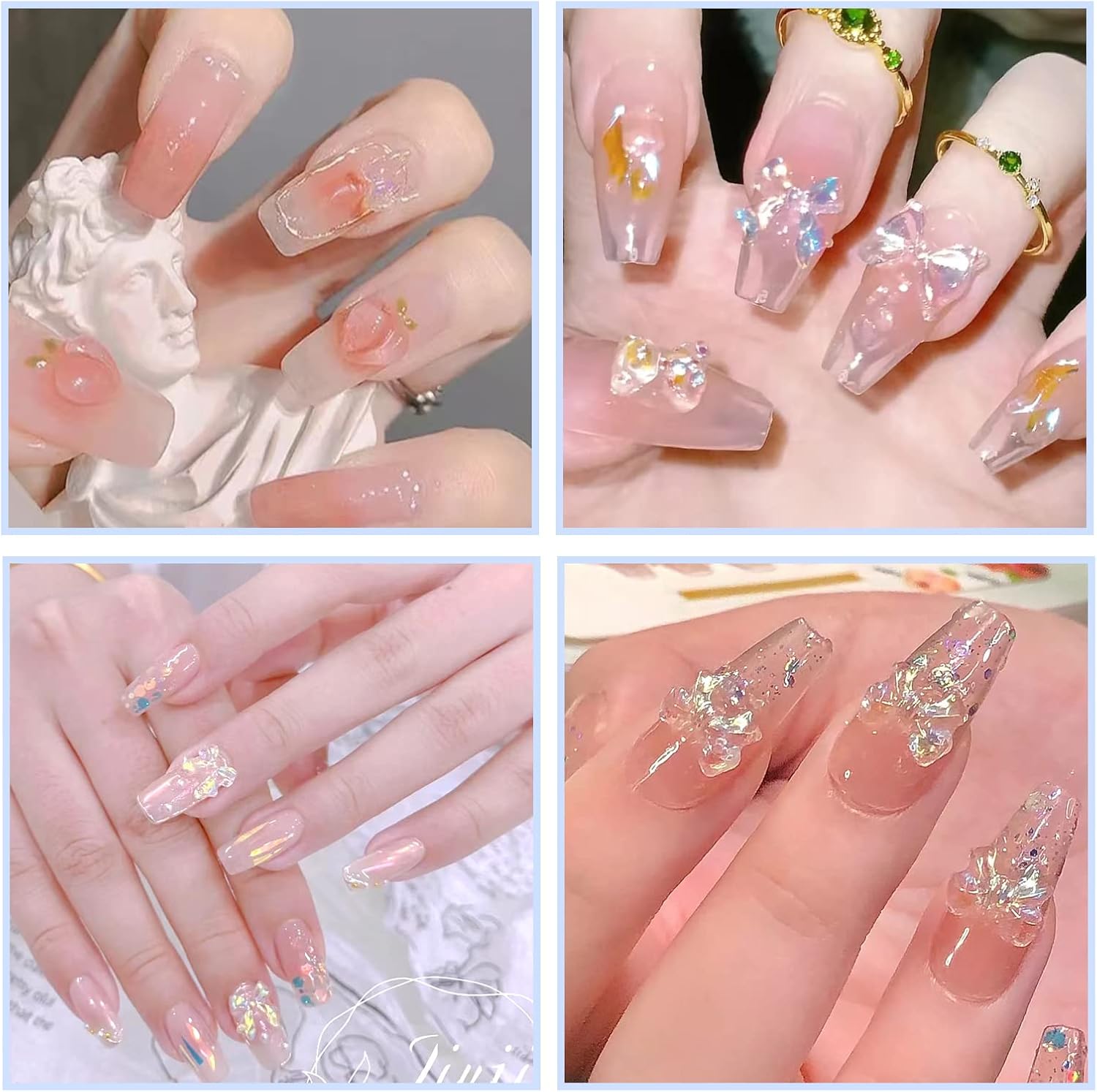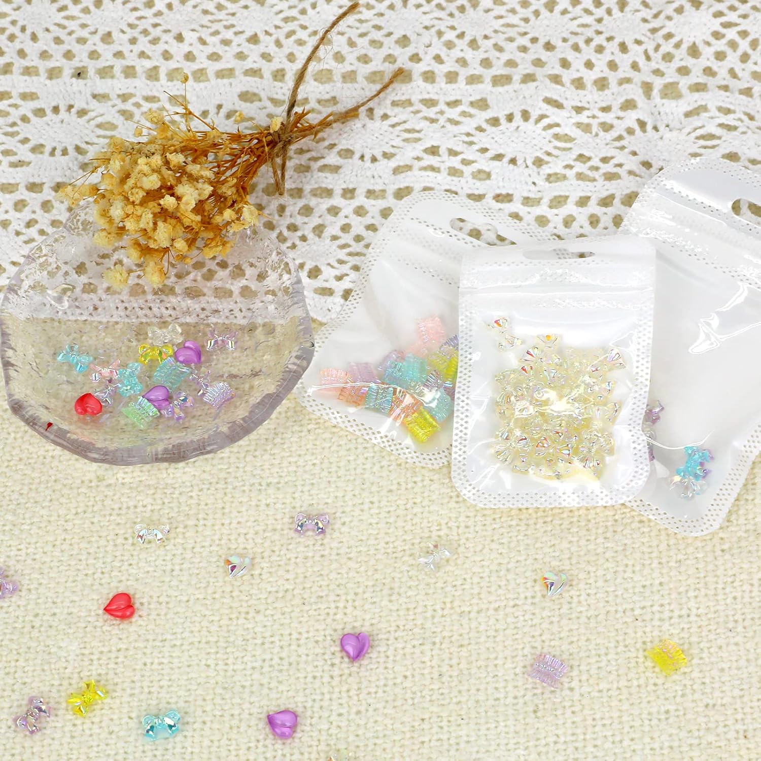 6cmpacking list:30pcs skirt cute nail charms 30pcs transparent bow cute nail charms 50pcs colorful bow cute nail charms 10pcs purple peach cute nail charms 10pcs pink peaches cute nail charms 10pcs magic peach cute nail charms 40pcs heart cute nail charms