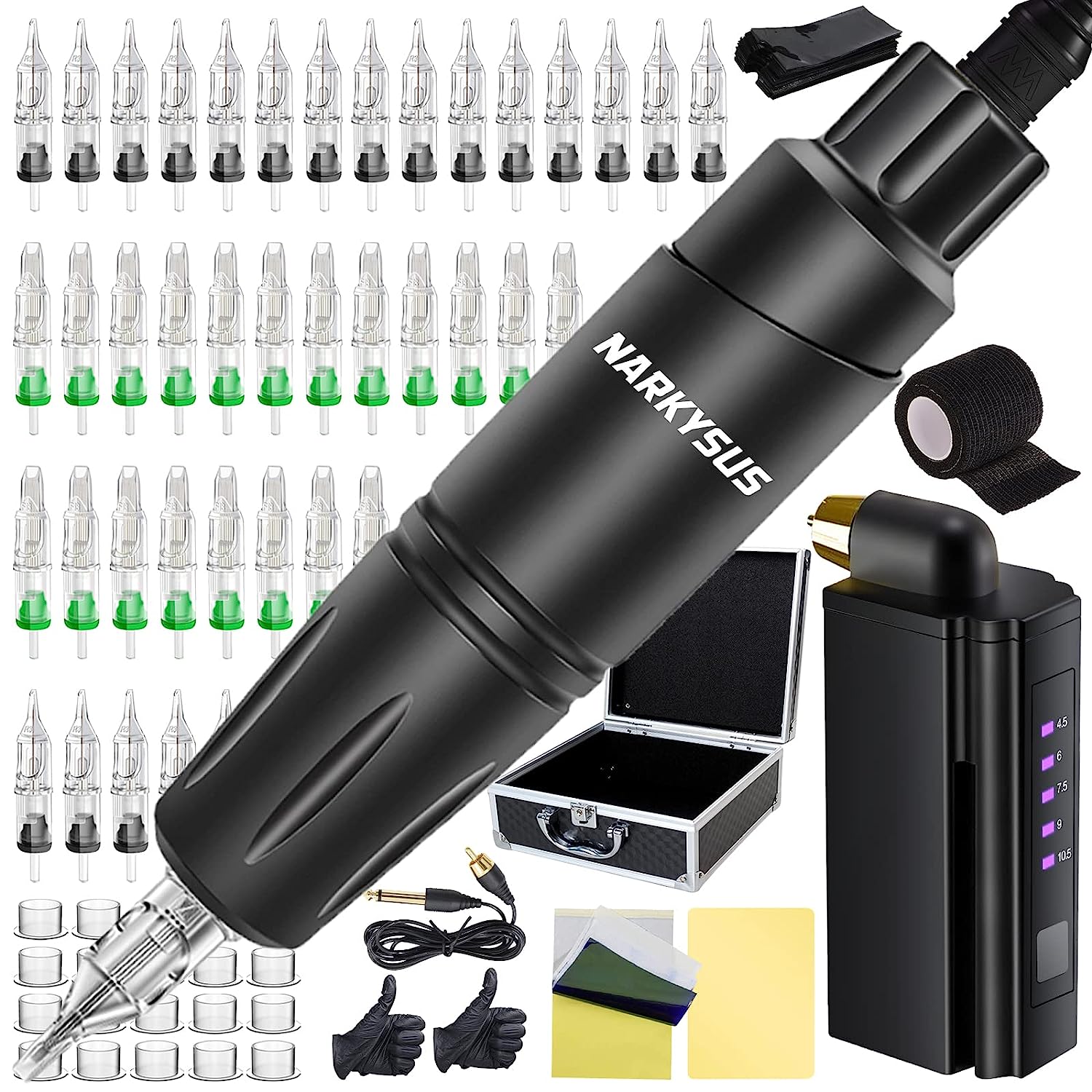 • COMPLETE KITThis Tattoo Pen Kit includes 1 tattoo pen, 1 power supply, 1 foot pedal, 60pcs cartridge needles, 2pcs transfer paper, 1pc tattoo bandage, 2pcs practise skin, 1 box of machine pen covers, 50pcs ink caps, 2 pairs of gloves and a exquisite case.