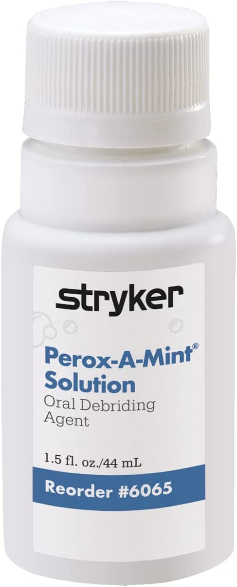 ”1 Perox-A-Mint Solution helps break down plaque buildup to keep the mouth healthy and clean.